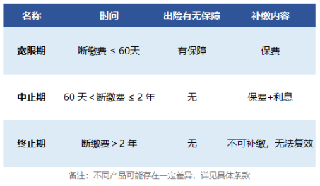 如果您在寬限期結(jié)束后未支付保費(fèi),你將不再享受保險(xiǎn)。如果您確實(shí)忘記了付款,則可以在寬限期后的60天內(nèi)補(bǔ)交保費(fèi)。