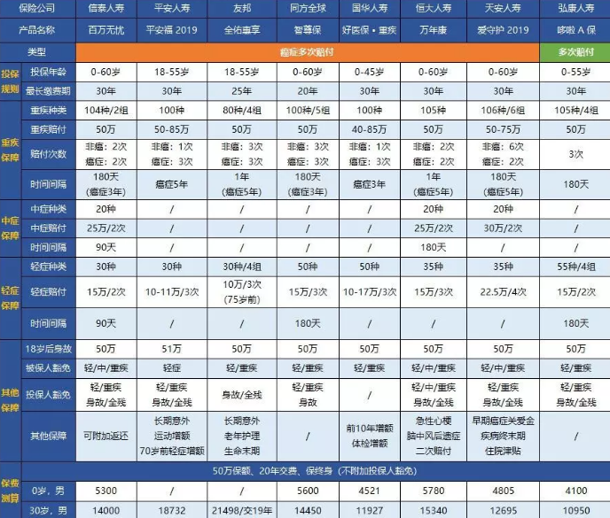 今天我為每個(gè)人找來(lái)了7個(gè)癌癥多次賠付產(chǎn)品,并添加了重疾多次賠付產(chǎn)品進(jìn)行比較,它們分別是:
