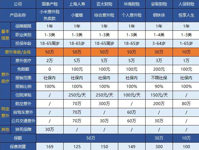 今天我對市場上的幾款意外險(xiǎn)進(jìn)行了具體分析,測評產(chǎn)品如下: