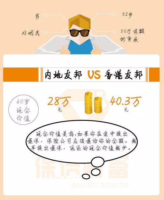 例如,被保險(xiǎn)人是一名32歲的非吸煙男子,他想要支付50萬(wàn)保額的嚴(yán)重疾病。他對(duì)友邦非常有信心并且最初準(zhǔn)備在內(nèi)地投保,但是一位朋友告訴他購(gòu)買(mǎi)香港保險(xiǎn)。便宜! 香港友邦相同的保額,保障更高,保費(fèi)更低。
