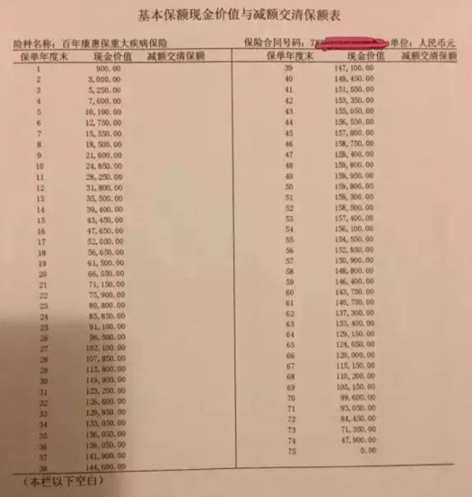 注意:百年康惠保的現(xiàn)金價值,上圖中的現(xiàn)金值表示每年可以返回的金額為退保的錢,減額交清則是在無法續(xù)交保費(fèi)時,現(xiàn)金價值充當(dāng)保費(fèi)。