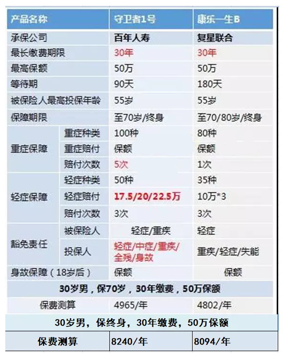 一個(gè)重疾多次賠,一個(gè)重疾一次賠;一個(gè)輕癥保額賠付高,一個(gè)輕癥保額少,而保費(fèi)只相差200元,此時(shí)應(yīng)該給守護(hù)者1號(hào)一些掌聲!