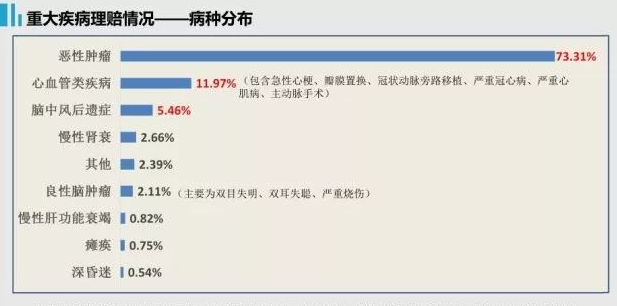 保險重大疾病保險不是更多類型的疾病,在重癥疾病保險中普遍存在的六大疾病:惡性腫瘤、急性心肌梗死、主要器官移植或造血干細胞移植、冠狀動脈旁路移植術(shù)、終末期腎病、中風后遺癥占絕對比例(概率超過80%),這基本上滿足了一般保單持有人的保障需求,保障范圍涵蓋了50種嚴重疾病,遠遠超過保險行業(yè)協(xié)會定義的嚴重疾病數(shù)量(25種),覆蓋范圍賠付可以達到97%。就概率而言,其中有四十個和幾百個沒有太大的不同。